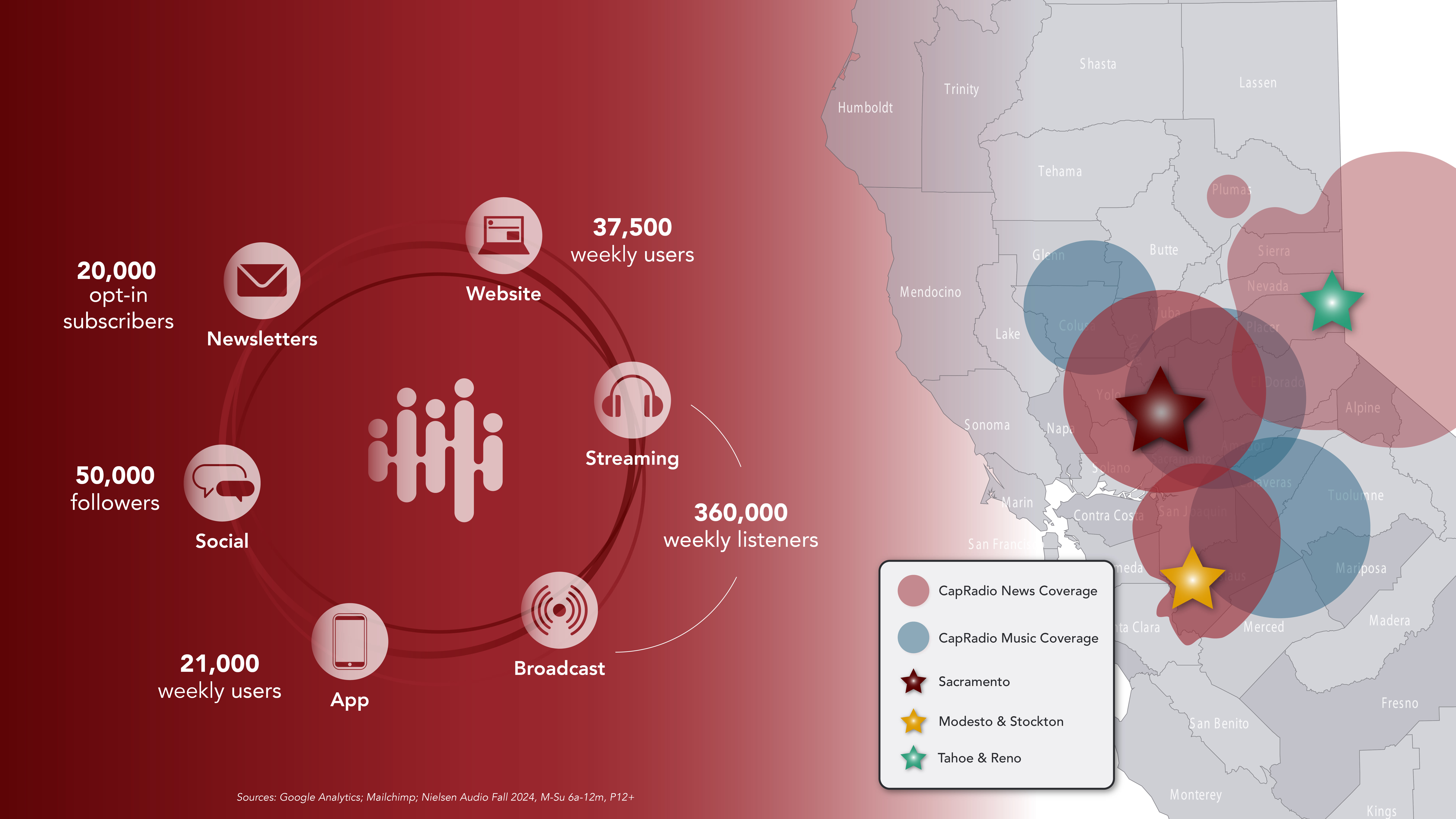 CapRadio is a mission-driven public media organization committed to helping our community stay informed, engaged and connected. As the region’s only nonprofit broadcaster with a 20-person local newsroom, CapRadio produces locally reported news alongside classical music and jazz programming that reflects and serves our region. Our work reaches listeners and readers through broadcast, streaming, newsletters, on-demand audio and in-person experiences across 32 radio towers and digital platforms.